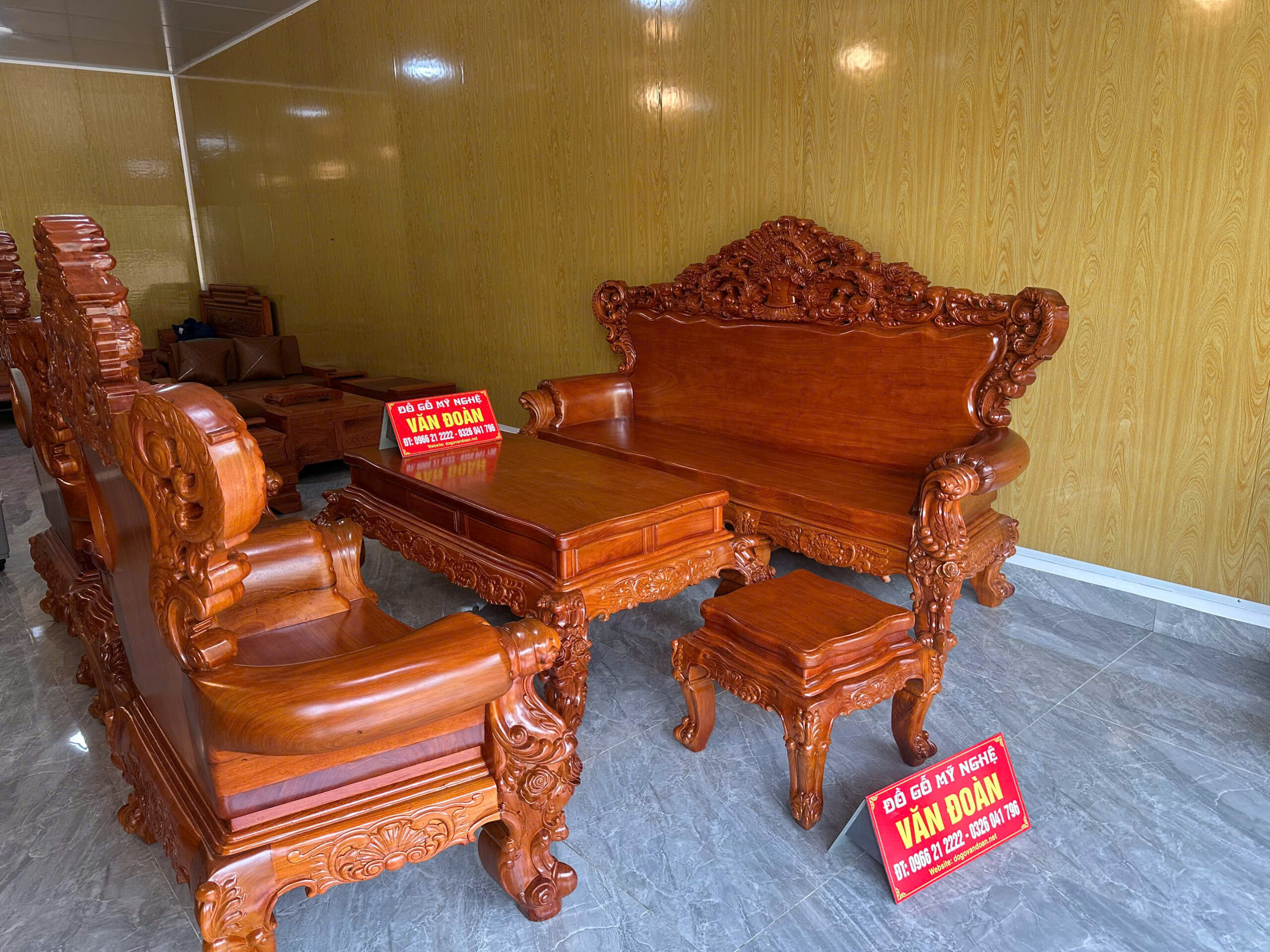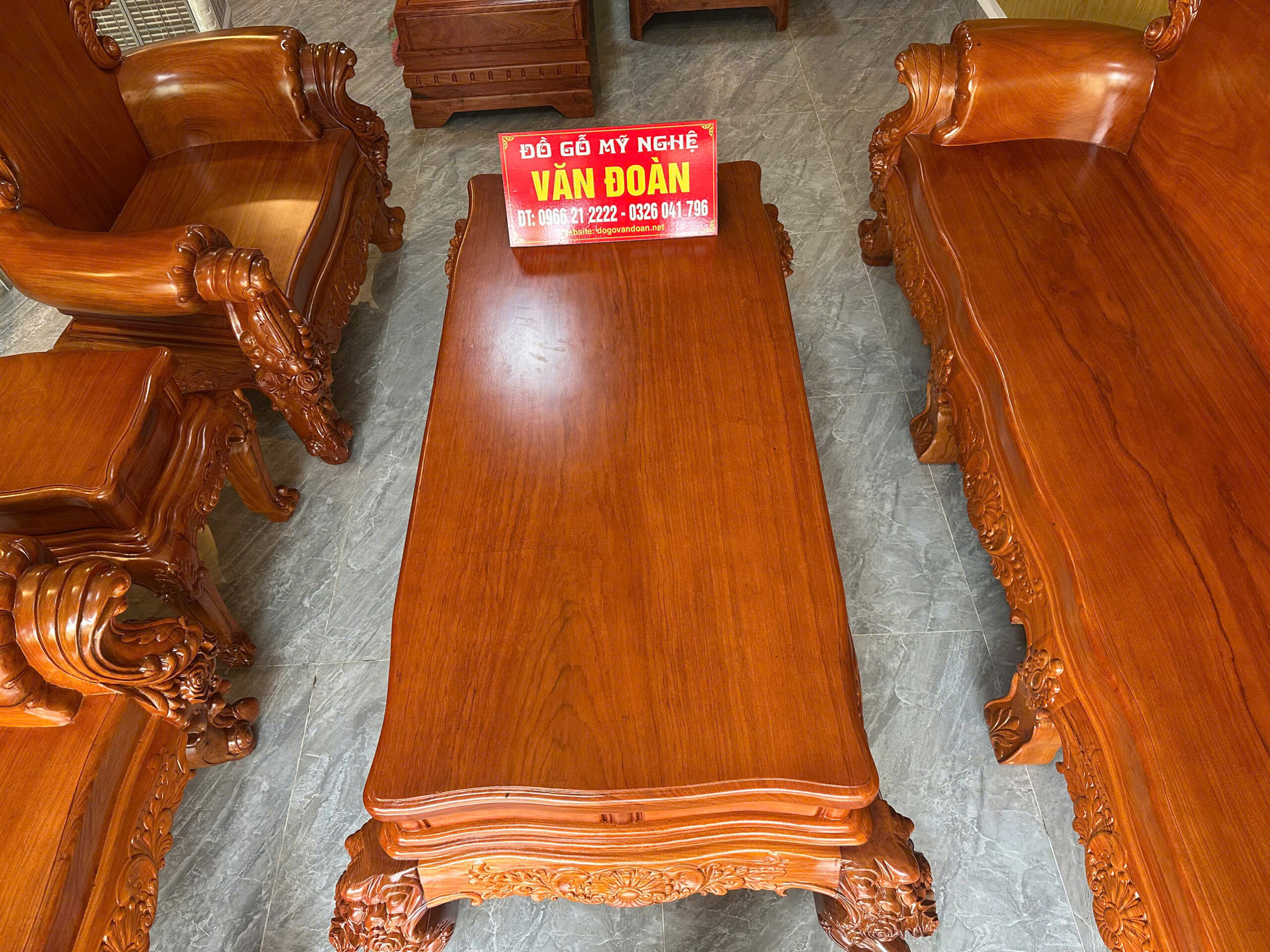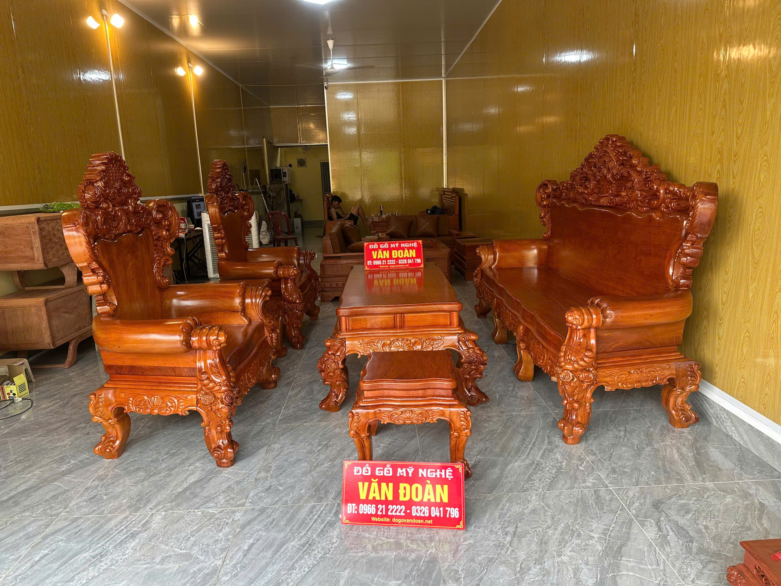 Chào mừng quý khách đến với siêu phẩm nội thất tại Đồ Gỗ Văn Đoàn. Bộ bàn ghế Hoàng Gia được chế tác từ dòng Gỗ Gõ Đỏ Pachy (Nam Phi) cao cấp nhất hiện nay. Với sự kết hợp hoàn hảo giữa nét đục chạm hoa hồng tinh xảo và kích thước bề thế, bộ sản phẩm chính là biểu tượng của sự giàu sang và thịnh vượng cho phòng khách biệt thự.