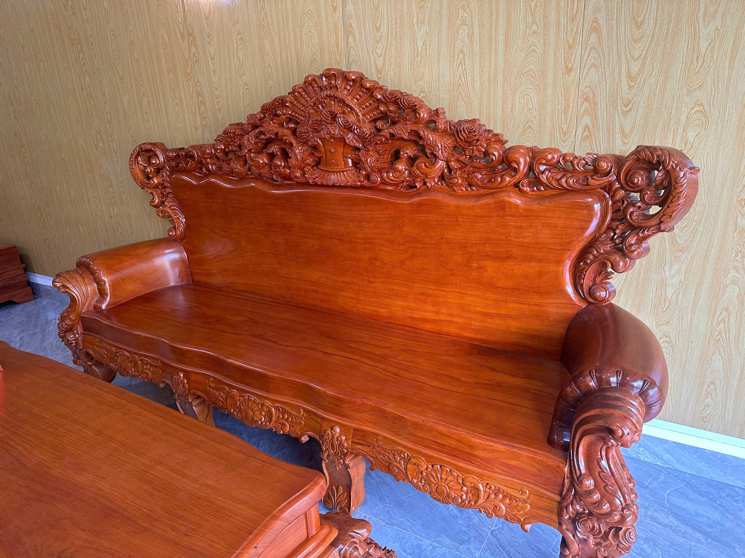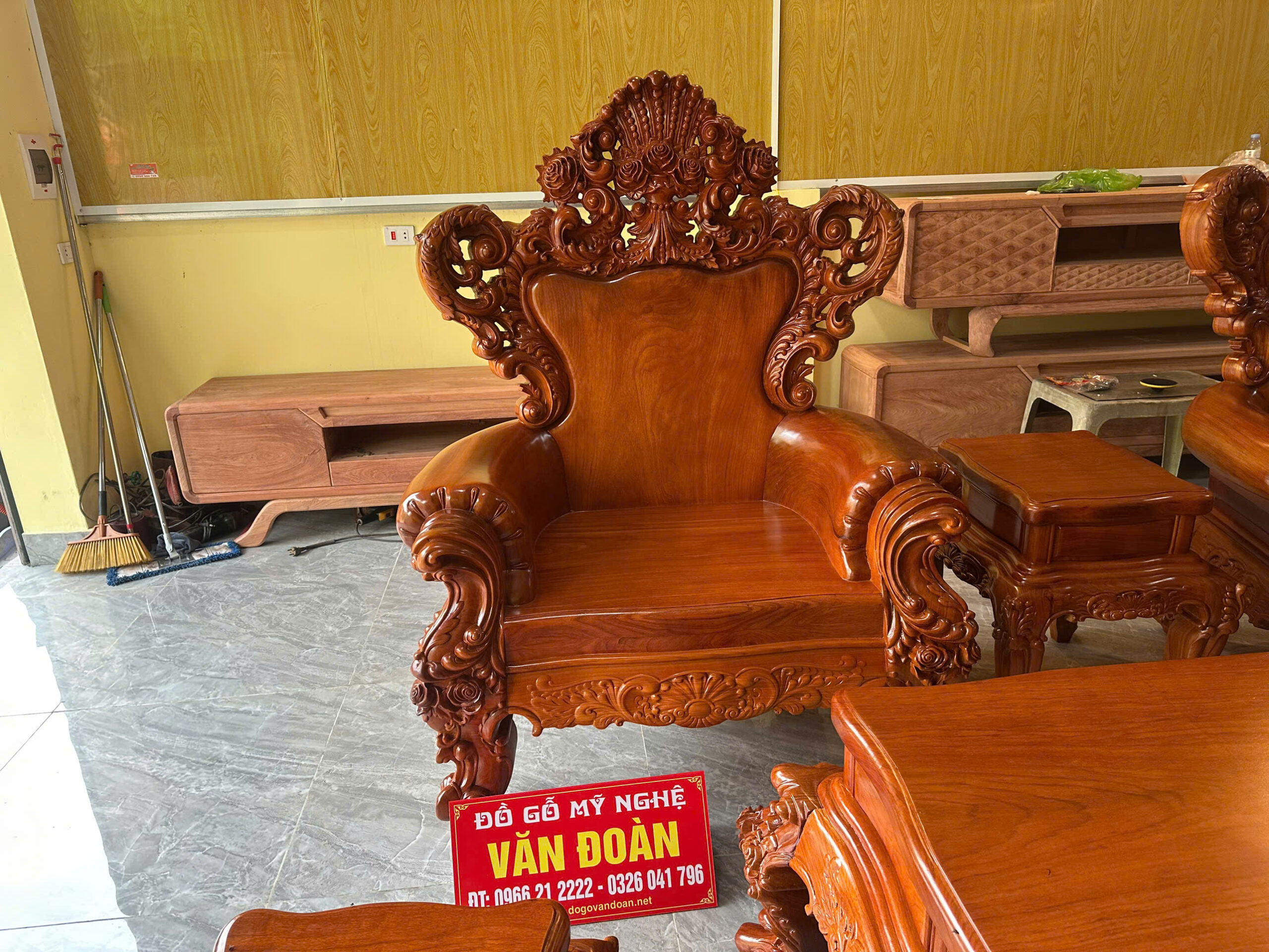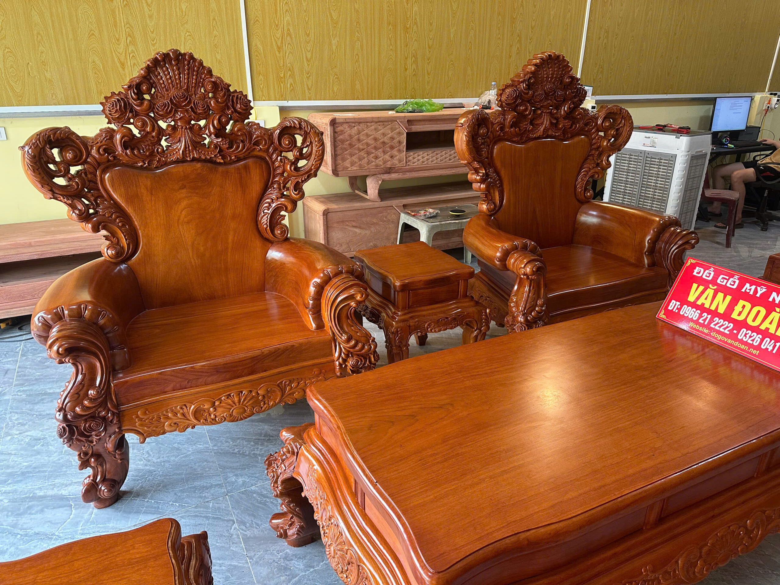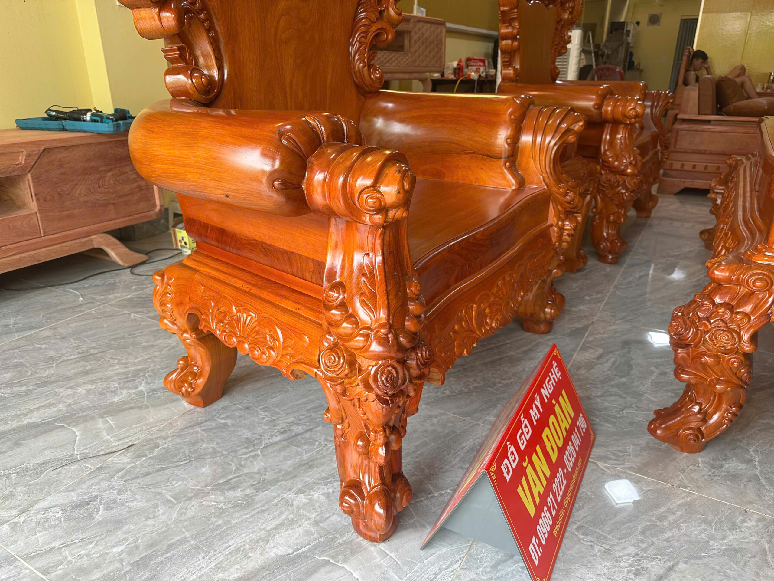 Chào mừng quý khách đến với siêu phẩm nội thất tại Đồ Gỗ Văn Đoàn. Bộ bàn ghế Hoàng Gia được chế tác từ dòng Gỗ Gõ Đỏ Pachy (Nam Phi) cao cấp nhất hiện nay. Với sự kết hợp hoàn hảo giữa nét đục chạm hoa hồng tinh xảo và kích thước bề thế, bộ sản phẩm chính là biểu tượng của sự giàu sang và thịnh vượng cho phòng khách biệt thự.